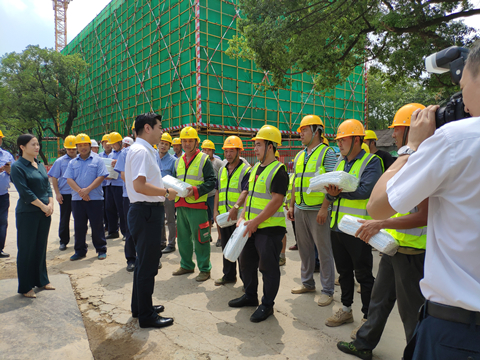 8月21日上午十一点,接近中午烈日炎炎,湘江集团党委书记、董事长张利刚一行来到中航建设集团承建的长沙科技创意园项目,现场看望慰问高温天气下依然坚守战斗在岗位上的广大建设者,为大家送来了冰箱、电风扇、凉茶、藿香正气水、夏桑菊、西瓜等防暑降温用品。