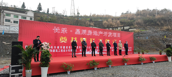 2021年1月26日上午,由中航建设集团承建的长乐▪星辰住宅项目奠基暨开工仪式在项目现场热烈举行。湖北省宜昌市五峰土家族自治县住房和城乡建设局副局长陈白华、县质量安全监督站站长邓简涛、中航建设集团五峰长乐▪星辰项目经理王国云,项目参建各方及新闻媒体共40余人出席。宜昌市长乐城市建设投资开发有限责任公司总经理刘鹏主持。
