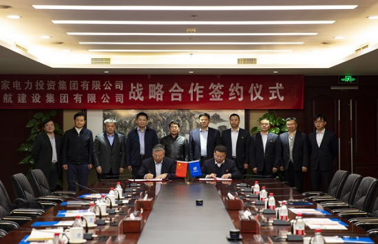 在参会人员的共同见证下,国家电投集团火电与电力协同产业首席协调官、产业中心主任吴金华和中航建设集团总经理宋利坡代表双方签署了《战略合作协议》。