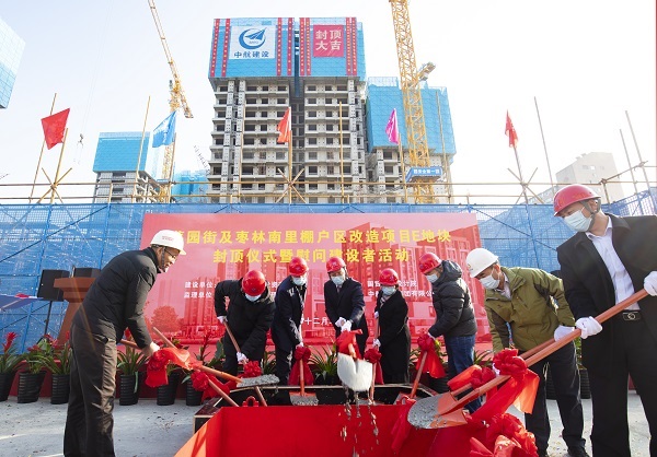 12月22日,伴随着最后一方混凝土浇筑到位,在项目建设、监理、设计等相关单位负责人及集团公司领导的共同见证下,中航建设集团承建的菜园街及枣林南里棚户区改造项目喜迎主体结构封顶。